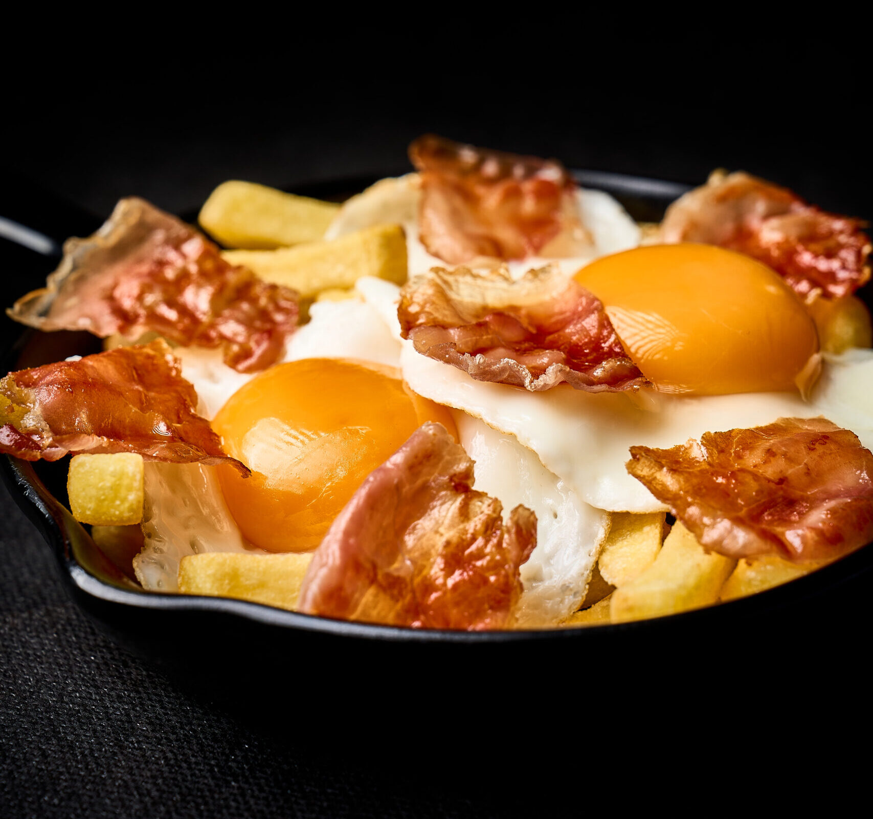 Huevos sobre cama de patatas artesanas, con virutas de chorizo ibérico que funden sabor y tradición.