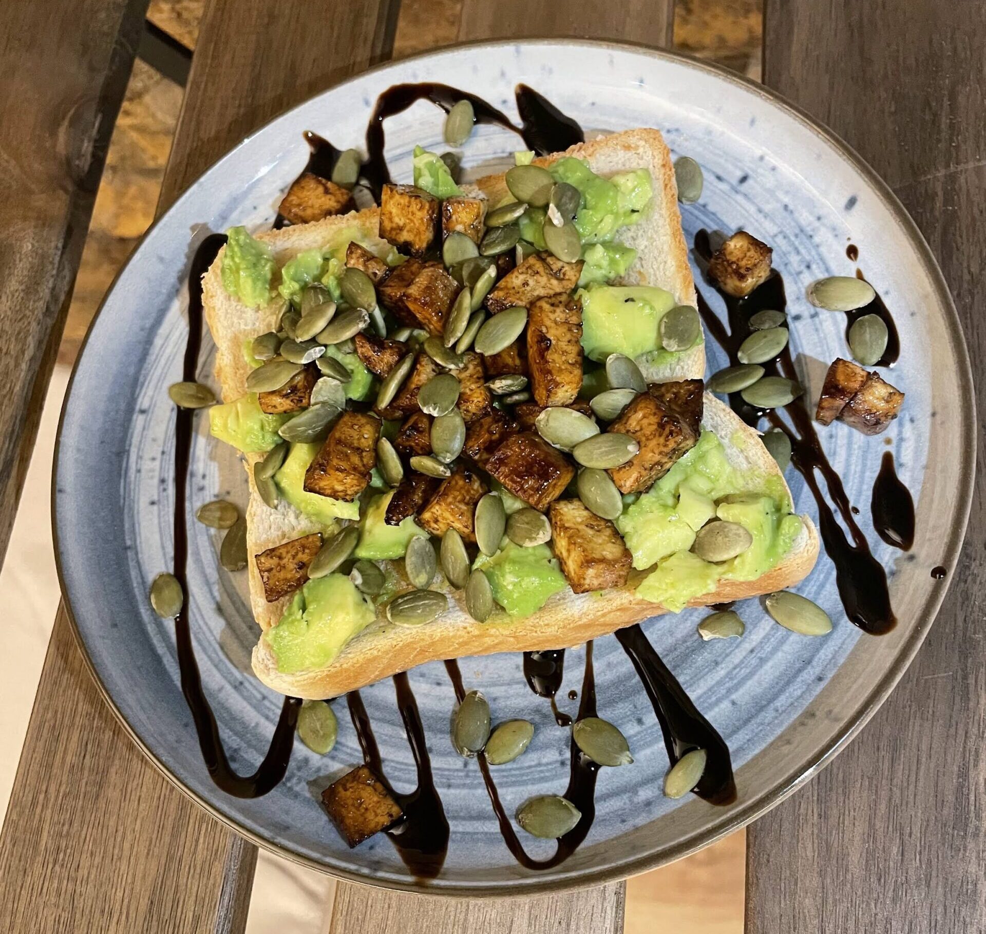 Pan de masa madre, crema de aguacate fresco, tofu a la plancha y semillas tostadas. Sabor y equilibrio.
