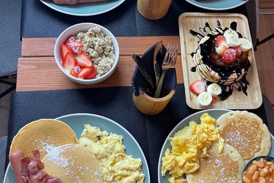 Huevos al gusto, bacon crujiente, baked beans, salchicha y dos pancakes con sirope. ¡Brunch redondo!